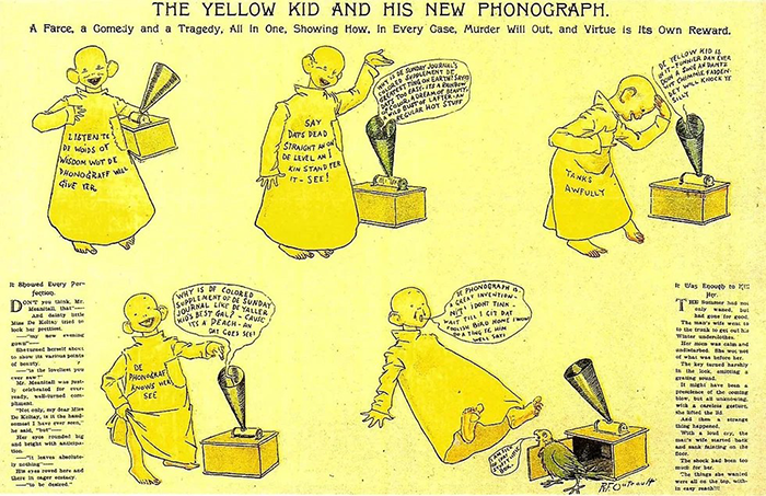 아웃콜트(Outcault, Richard Felton/1863~1928/미국) 옐로우 키드와 그의 축음기(뉴욕 월드지 신문 컬러 삽화/1896년 10월 25일) 당시 혁신 기술이었던 에디슨이 발명한 축음기를 소개하는 에피소드이다. 이민자들의 삶과 뉴욕 빈민가의 현실을 반영하며 큰 성공을 거둔 신문 연재 만화로 미국 만화사의 시작점으로 인정 받는다. 엘로우 키드는 당시 빈민가 거리 아이를 표현한 것으로 대머리에 큰 귀 그리고 항상 커다란 노란색 잠옷을 입고 있다.