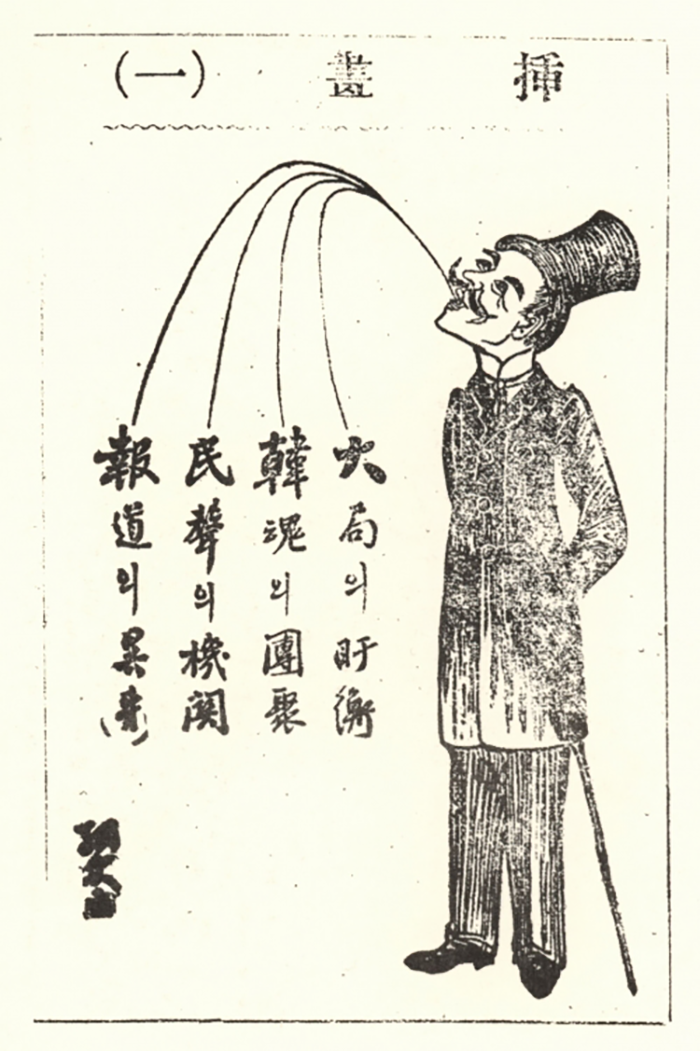 이도영(李道榮/1884~1933/한국) 근대 서화가이자 시사 만화가, 삽화가, 교육자이다. 1901년 안중식 등 의 문하에서 전통 회화를 배웠다. 이도영이 붓으로 그린 이 신문 삽화(1909년 6월 2일자)는 한국 최초의 시사 만화로 평가 받는다. 연미복을 입고 서양 모자에 지팡이를 든 개화 신사가 ‘대한민보’의 창간 취지를 4행시로 구성한 형식적 특징을 보인다. 또한 근대적 언론 매체로서 신문의 역할과 의미를 제시하고 있으며 당시 대한제국의 위태로운 상황 속에서 민족의 단결과 계몽을 호소하는 메시지를 담고 있다는 시대적 의미를 지닌다.