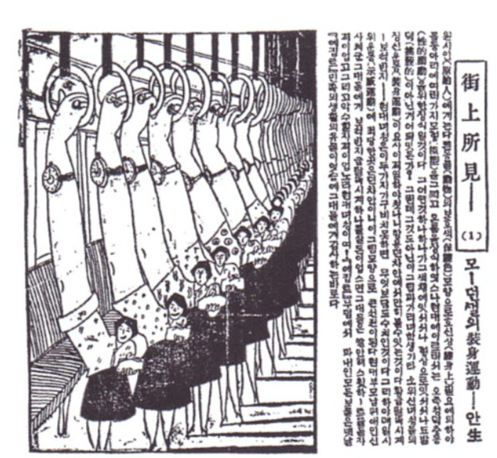 안석주, <모-던 껄의 장신운동(裝身運動), 가상소견(1)」, 『조선일보』, 1928. 2. 5 모던을 상징하는 전차를 타고 빈자리가 많은 데도 시계와 커다란 반지를 자랑하듯 서 있는 단발머리 여성들의 허영심을 풍자하고 있다.(한국만화박물관)