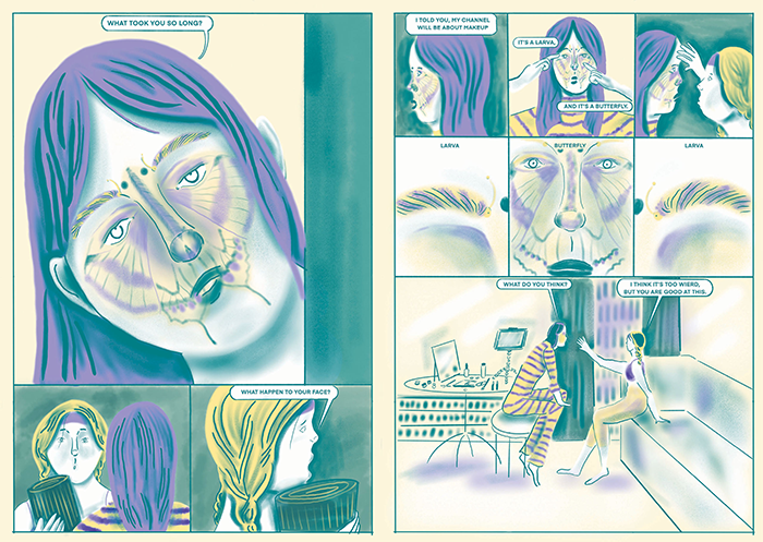이빈소연 <수치의 모양Shape of Shame> (영문판) 만화에 조각, 영상, 설치 등 다양한 장르를 접목하여 표현하는 작가는 몽환적 색감과 독특한 구성으로 미디어 속 다양한 군상의 행태를 탐구한다. <수치의 모양>은 현대 사회에서 자신이 느끼는 부끄러움, 두려움, 경계의 문제를 다룬다.