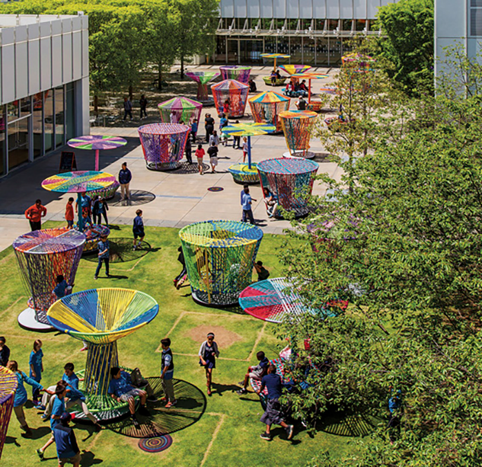 나무 팽이 장난감에서 영감을 받아 만든 형형색색의 벤치 겸 그늘막 형태의 공공 미술 작품으로, 멕시코 전통 직조 방식을 활용했다. 회전이 가능해서 더욱 즐겁게 휴식할 수 있다.