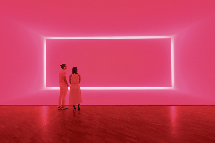 터렐(Turrell, James/1943~/미국) 레마르 핑크 화이트(Raemar pink white/벽에 조명 설치/4.4×10.7m, 조명의 깊이 3m/1969년/2014년 로스앤젤레스 케인그리핀코코란갤러리 전시 장면)