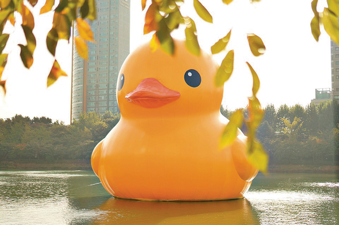 호프만(Hofman, Florentijn/1977~/네덜란드) 러버덕 프로젝트(폴리염화비닐/가변 크기/2007년 이후/2014년 서울 석촌호수 설치 장면)