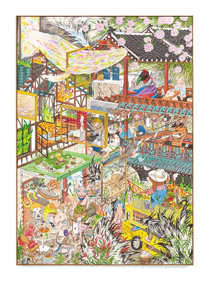 김훈규(1986~/한국) 유지하다×일관성(비단에 채색/128×80cm/2021년) 불화의 섬세한 선과 화려한 색채 그리고 애니메이션의 캐릭터를 결합한 작가는 쇼핑이나 휴대폰에 몰두하는 의인화된 동물들로 가득 찬 대형 화면을 통해 유머와 어두운 세계관이 공존하는 초현실적인 공간을 보여 준다.