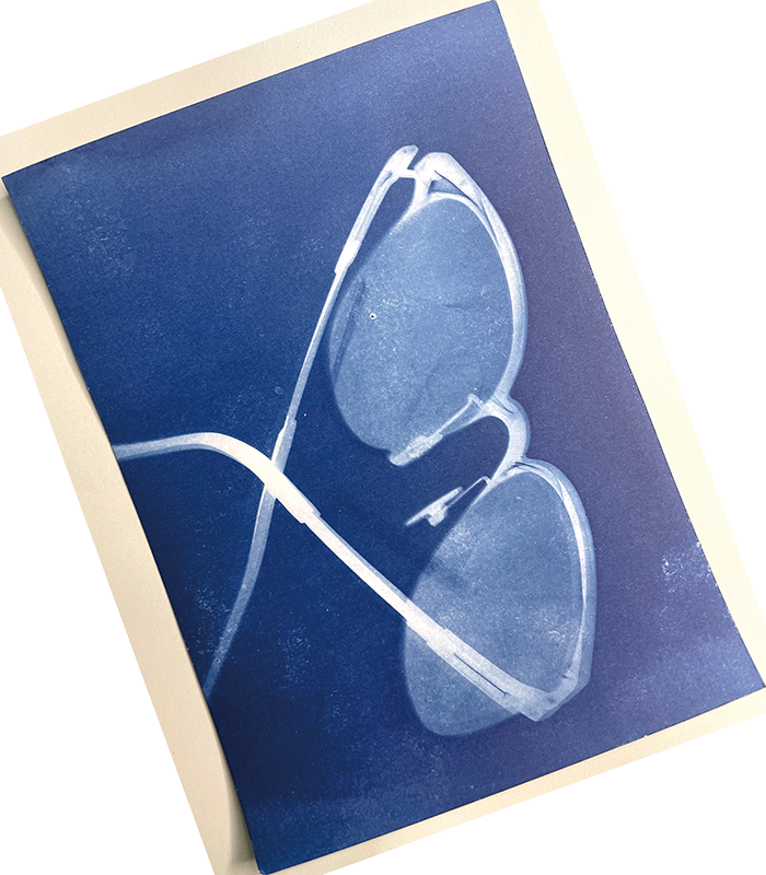 진현수(학생 작품) 나의 눈(청사진용 감광 용액, 도화지, 안경 등/18×15cm/2023년)