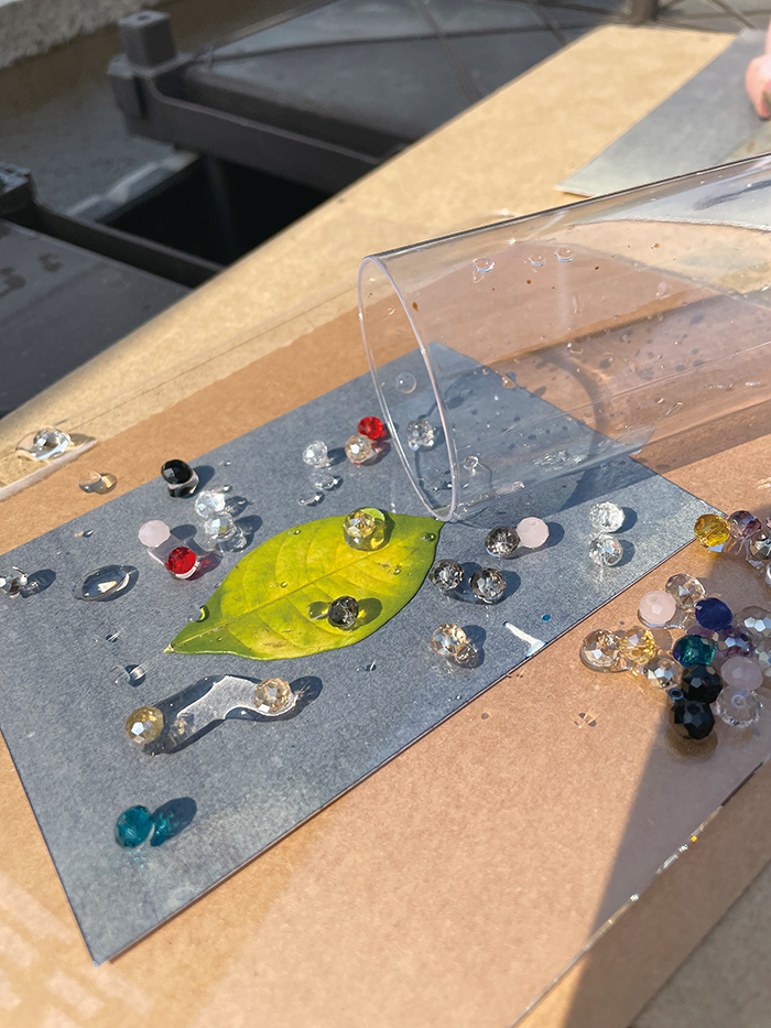김진석(학생 작품) 반짝이는 순간(청사진용 감광 용액, 낙엽, 구슬 등/18×15cm/2023년)