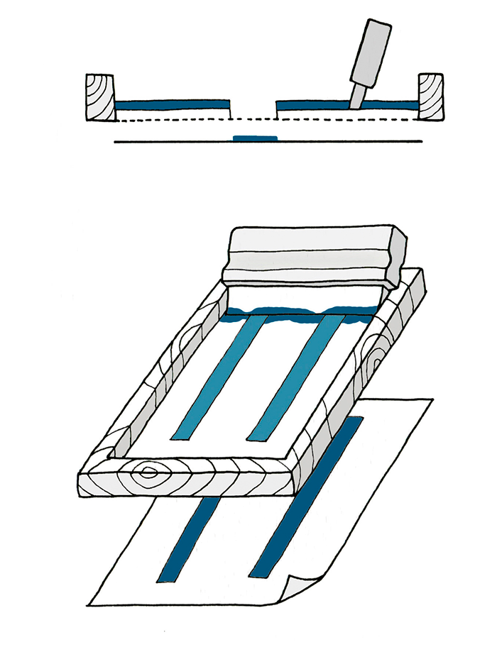 제작 과정: 실크 스크린 틀에 그림 그리기 → 실크 망에 감광액 도포 → 빛에 노출시켜 감광액을 굳힘 → 미노출 부분을 물로 세척 → 틀 위에 잉크를 놓고 스퀴지로 밀어서 찍어 냄