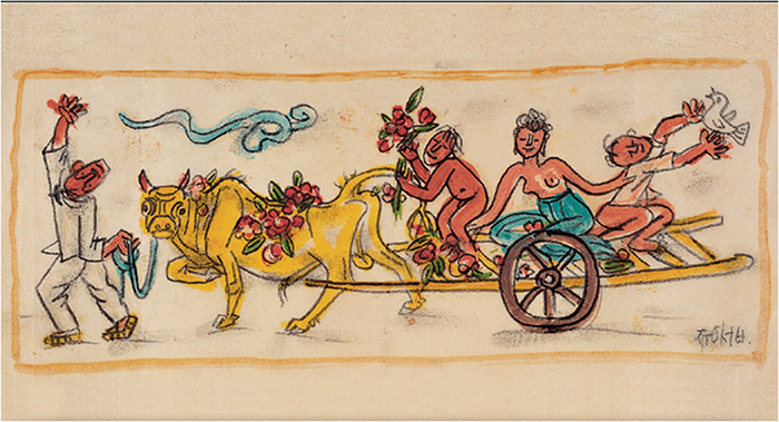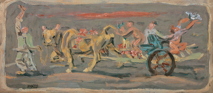 소달구지를 끄는 작가와 달구지에 탄 아들들과 부인의 행복한 모습을 그려 가족에 대한 사랑과 그리움을 표현하였다.
